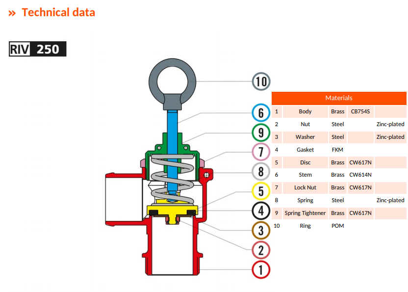 - The valve can be easily adjusted to the desired pressure (from 0,5 to 1,5 bar – from 7 to 21 Psi) and it can be sealed tamper-proof through the drilled tongues.